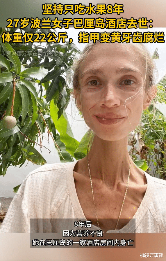卡罗琳娜,27岁,波兰人。她死于对水果的“忠诚”。八年来,她拒绝一切,只吃水果。结果,她的身体在巴厘岛的一家酒店里停止了工作,体重仅剩22公斤。