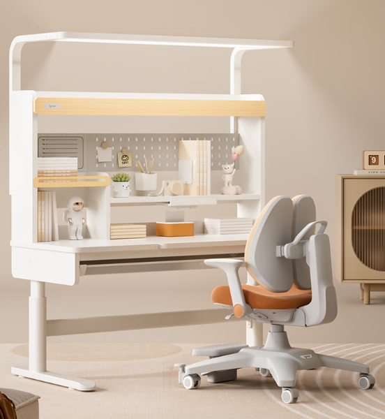 配套的人体工学椅专为孩子打造,自动追背功能能动态贴合背部曲线,帮孩子保持正确坐姿,呵护脊椎发育,多维调节可找到最舒适的坐感。双控轮能灵活切换移动和锁定,孩子起身入座更方便,久坐也不会觉得累,完美适配开学后的日常学习。