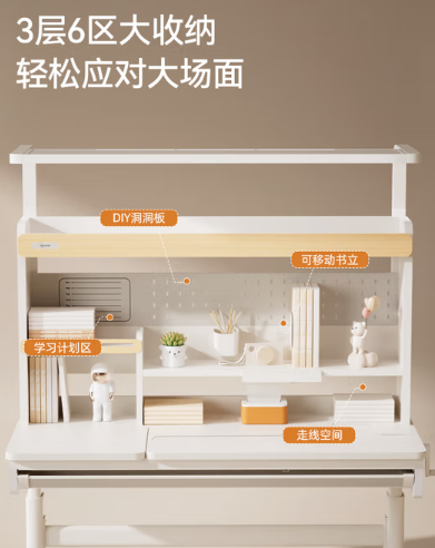 桌灯一体的设计是核心亮点,大面积垂直照明能减少学习区阴影,98cm黄金光距让光线更均匀,搭配模拟清晨晨光的全光谱光源,接近自然光的视觉体验,有效减少长时间学习的眼疲劳,刷题、看书都更舒服。书桌支持角度调节,写作业、读课本可灵活切换,L型分区让水杯、文具各归其位,竖向收纳空间能整齐放下新学期的课本和练习册,手摇升降设计还能随孩子身高调节,小学到初中都能用。