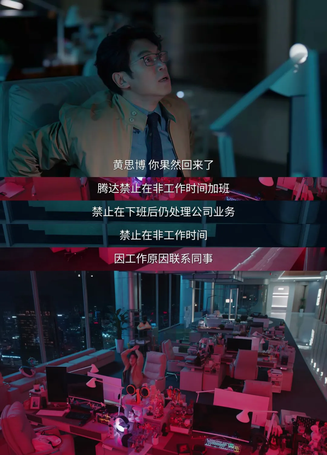 在腾达,员工准时下班、加班获得加班费、按项目投入分配奖金……这些本应是职场常态的规则,却成为员工们倍感意外的地方;相反,在推崇狼性文化的游戏公司天火,老板周暮岩(叶祖新 饰)却理所当然地将双休视为对员工的嘉奖。