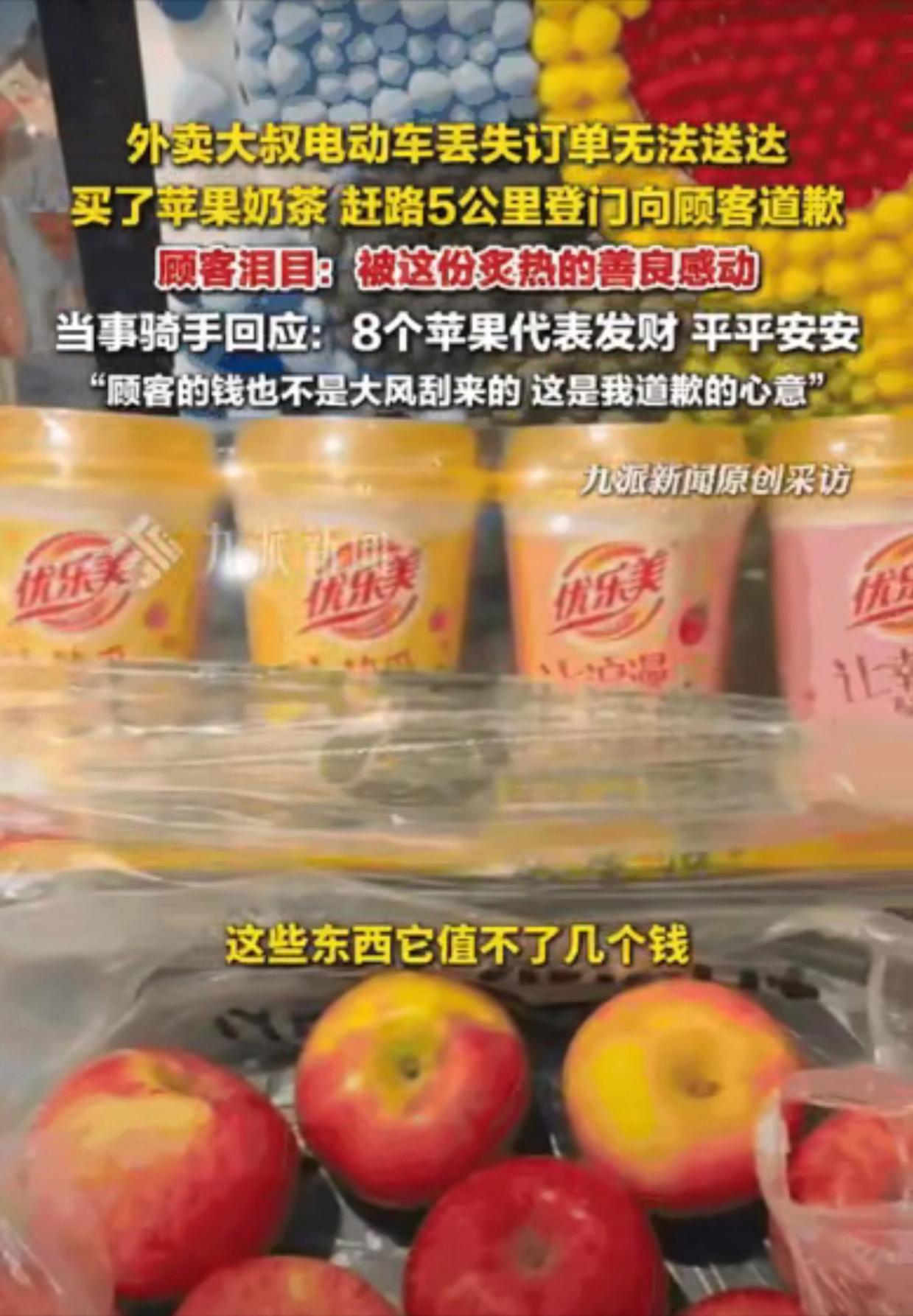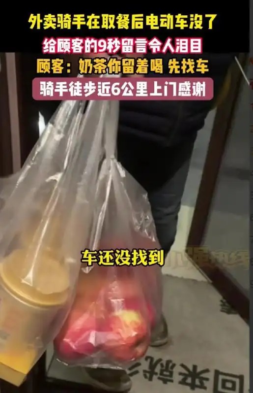 这位大叔取餐回来的短短几分钟,电动车就没了踪影,可比起丢车的崩溃,他更记挂着顾客的订单,最终他步行 5.6 公里上门给买家道歉。