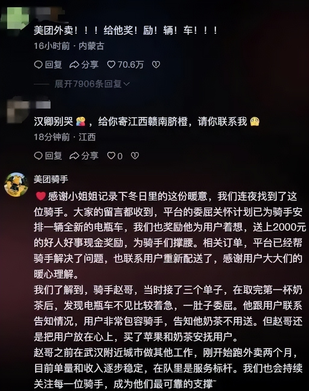 后来这事被平台知道了,大家都被大叔的责任心打动,不仅授予他 “先锋骑手” 的称号,还特意送了他一辆全新的电动车,外加 2000 块现金奖励,帮他解了燃眉之急。