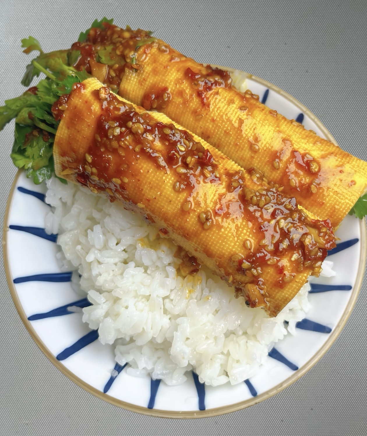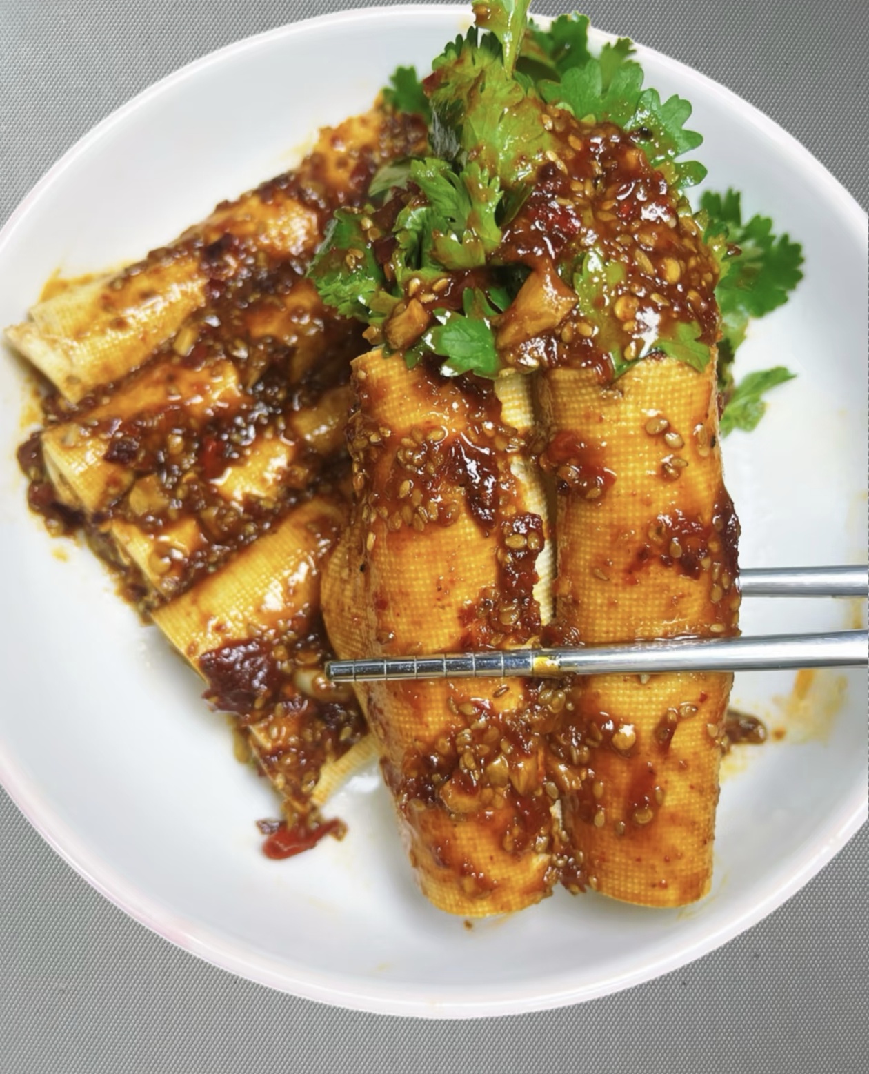 最后就是灵魂组装了。把放凉的酱汁均匀地淋在豆皮卷上,让每一寸豆皮都裹满红油,再撒上一把新鲜的香菜叶点缀,一道色香味俱全的香菜豆皮卷就做好了。刚做好的豆皮卷,外皮软嫩Q弹,里面的香菜清脆爽口,裹着浓稠的香辣酱汁,咬一口直接在嘴里爆开,豆皮的豆香、香菜的清香和酱汁的香辣完美融合,层次丰富又不腻人,连吃三个都不过瘾。