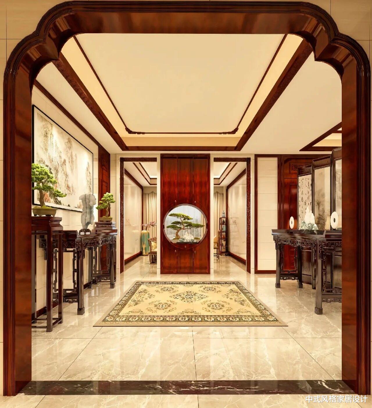 这是一处新中式风格的别墅玄关,整体氛围庄重雅致。深棕色实木雕花拱形门框框定空间,地面铺着米白大理石,中央嵌着带复古花纹的米黄地毯。两侧对称摆放深色实木条案,案上陈设盆景、古朴摆件,墙面挂大幅中式山水画。尽头红木门嵌圆形窗,窗内盆景与两侧绿植呼应,顶部灯带勾勒吊顶线条,柔和光线烘托出东方儒雅气韵。