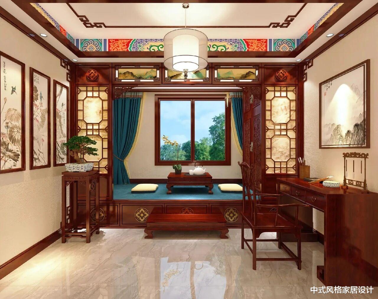 这是一间雅致的中式暖阁,以深色实木家具为基底,搭配米白墙面与浅灰大理石地面,沉稳又不失通透。窗边设榻榻米坐卧区,配蓝底软垫与矮几,两侧镂空雕花隔断透着古韵,窗外绿意为室内添生机。右侧是中式书桌椅,陈设文房雅器;左侧立柜上摆着盆景,墙面挂水墨山水画。吊顶彩绘与中式吊灯呼应,处处尽显中式美学的雅致与静谧。