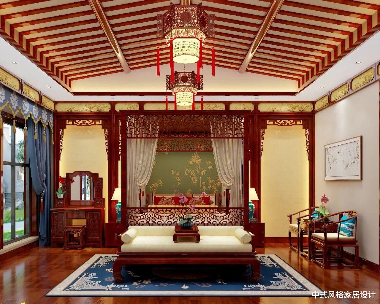 这是一间典雅的中式风格卧室,整体以深红实木家具搭配米白软装,沉稳又温馨。床头背景墙饰有竹纹刺绣,搭配雕花床架与垂落的纱帘,古韵悠然。天花板采用传统木构造型,悬挂两盏红木宫灯,暖光晕染出静谧氛围。窗边设梳妆台,旁侧摆放圈椅与茶几,地面铺着蓝白青花地毯,细节处尽显中式美学的精致与和谐。