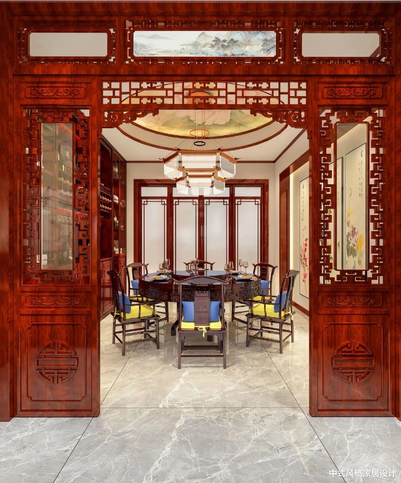 这是一处新中式风格的餐厅,以深色实木为基调,雕花镂空隔断搭配圆形藻井,将中式雅韵拉满。餐厅中央摆放着深色实木圆桌,搭配蓝黄配色坐垫的餐椅,沉稳又不失鲜活。背景墙的中式屏风与两侧挂画呼应,暖光灯饰晕染出古朴典雅的用餐氛围,传统美学与现代实用需求在此完美融合。