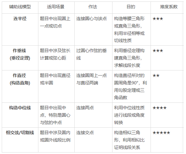 常见圆辅助线模型对比分析在初中数学几何证明中,辅助线的添加并非灵感爆发,而是基于特定条件的逻辑推导。以下是武汉中考高频出现的5种辅助线模型对比: