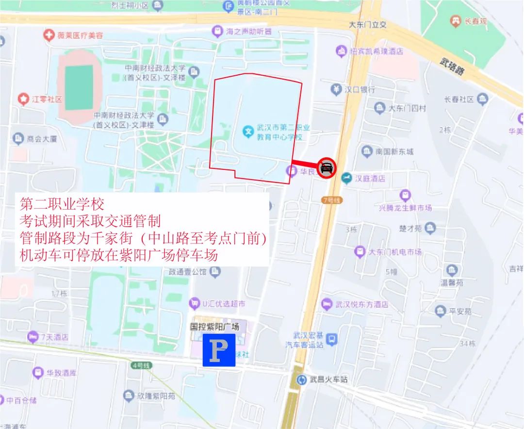 送考参考线路:经武珞路进入首义路后到达考点;经张之洞路、楚善街、长湖正街至首义路到达考点