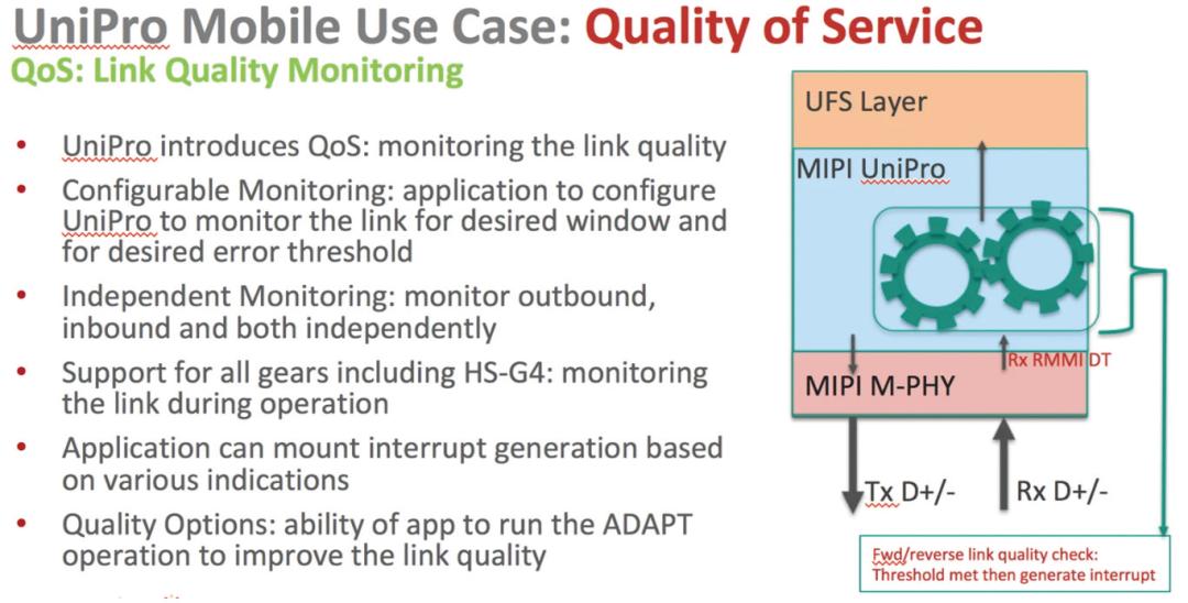 ▲UniPro通过RMMI与M-PHY通信,可以独立监控前向链路和反向链路。