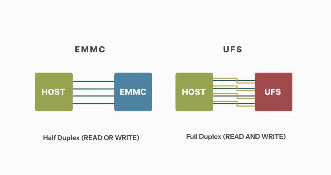 ▲UFS与eMMC存储架构对比示意图,展现了全双工与半双工工作模式的核心差异。