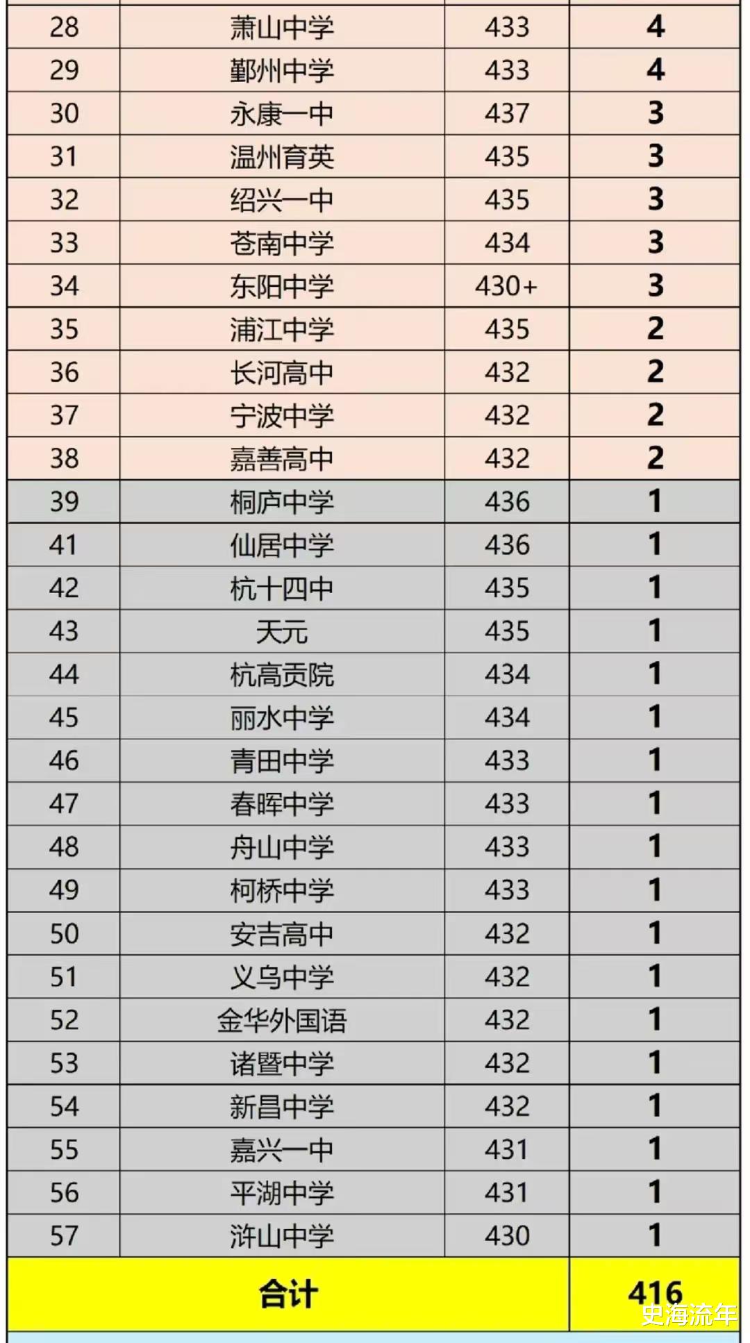 接下来,其他高中达到430分以上的人数,处于断崖式下降。排在全省第四的温州中学只有18人,这似乎不是正常的状态。2026年浙江省普通高中高三首考成绩公布后,网传430分以上高分段人数中,宁波市镇海中学、杭州学军中学、杭州二中等三所高中呈现“断崖式领先”态势,引发社会广泛关注。