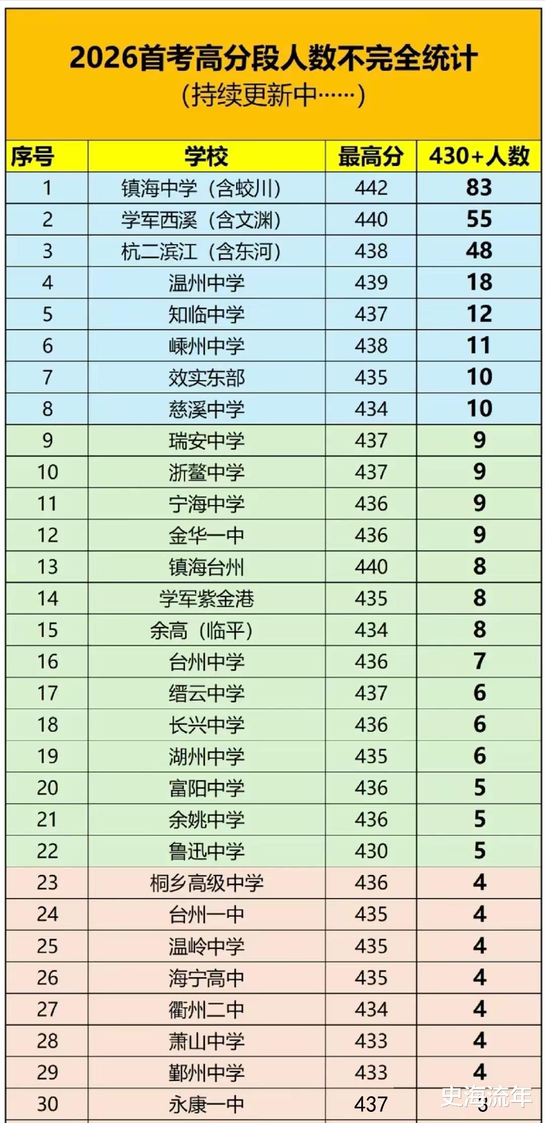 2026年浙江省首考成绩最高分为442分,仅扣了8分。第二名也有441分,第三名则是440分。而且,有的学校公布的430分以上的考生人数,也非常让人惊讶。比如:镇海中学430分以上的人数竟然有83人,学军中学也有55人,杭州二中有48分,在全省处于遥遥领先的地位。