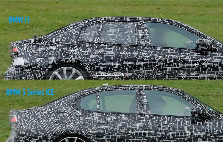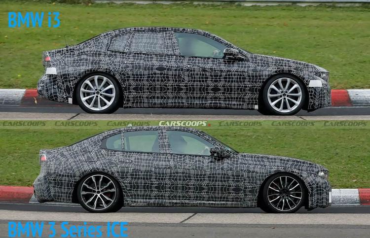 从前脸来看,两者共享相似的整体轮廓,但处理方式并不相同。全新3系在前保险杠下部设有一个明显的进气口,且疑似配备主动式格栅结构,这与其内燃机或插电混动系统的冷却需求有关。相比之下,i3虽然同样覆盖着伪装网,但从轮廓判断,其底部设计更倾向于封闭式布局,符合电动车对空气动力学和散热管理的不同要求。