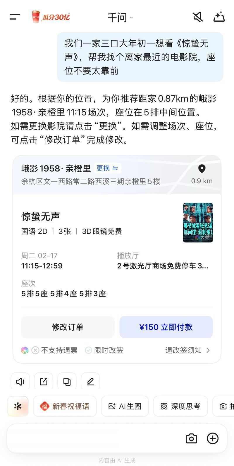 据悉,千问是全世界第一个实现用语音买电影票的AI助手。只需打开千问APP,说一句“我们一家三口想看大年初一的惊蛰无声,帮我找个离家最近的电影院,座位不要太靠前。”千问就会自动选好电影院、场次和座位,并生成订单,用户点击付款就可出票,全过程只需要十几秒。