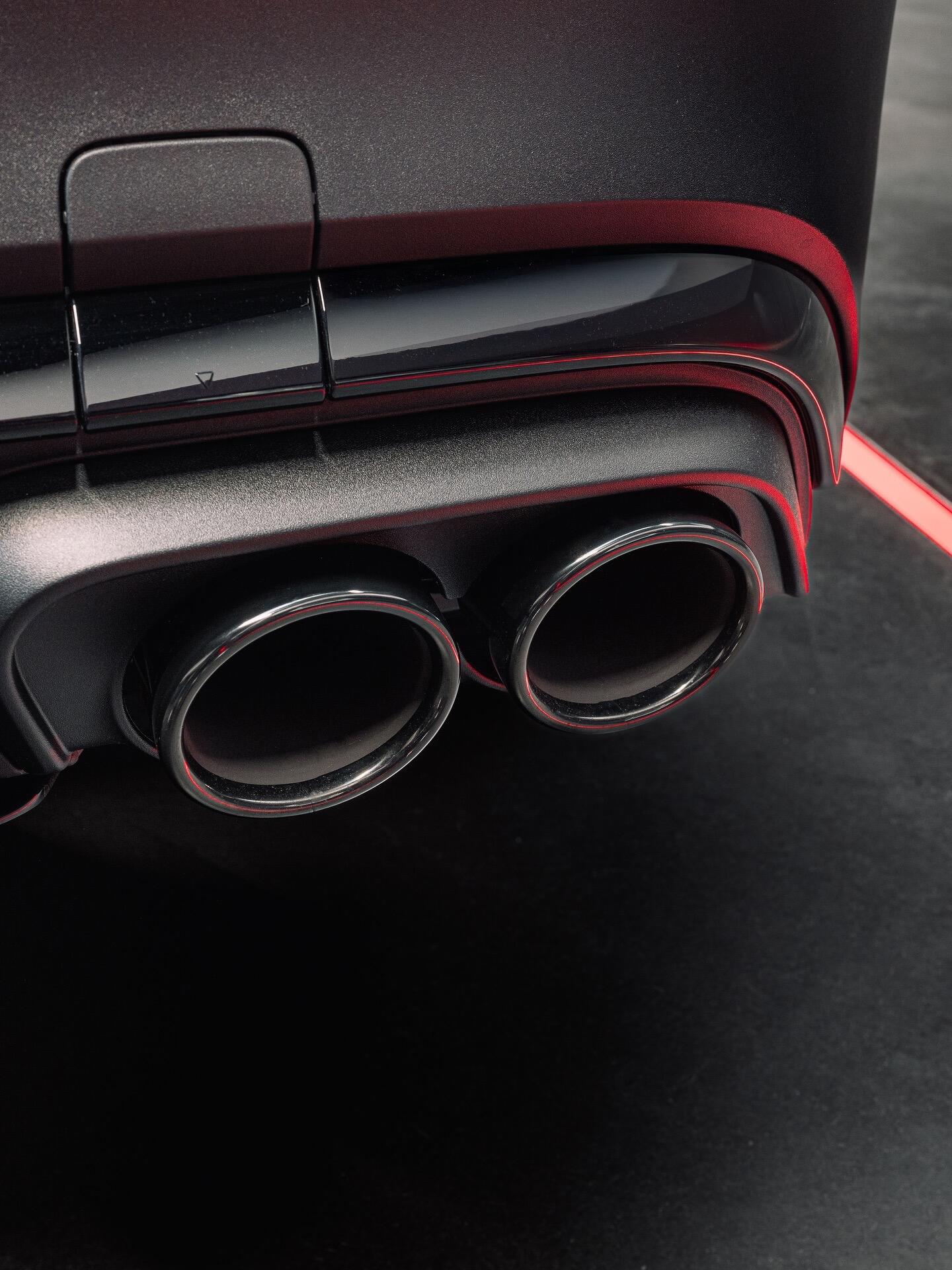 排气是双边四出,尾喉直径102mm,自带阀门控制。选装增强套件后,排气内壁加陶瓷涂层,声浪效果更好。