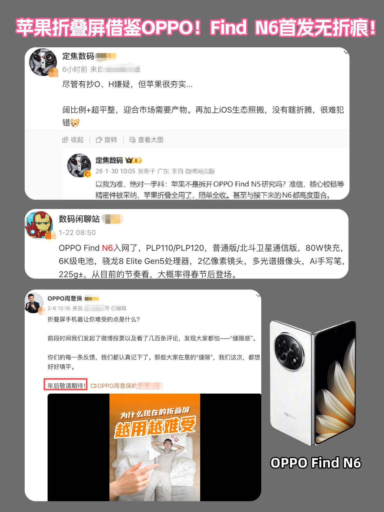 像是OPPO,在春节后我们就能见到没有折痕的Find N6!据说Find N6会用上黑绷带屏幕弱化折痕、同时加上液态金属铰链实现无折痕。
