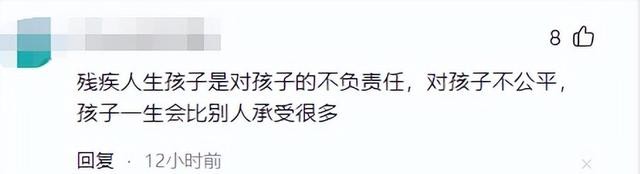 有人认为,残疾人生孩子是对孩子不负责任,对孩子不公平,孩子的一生会比别人承受很多。