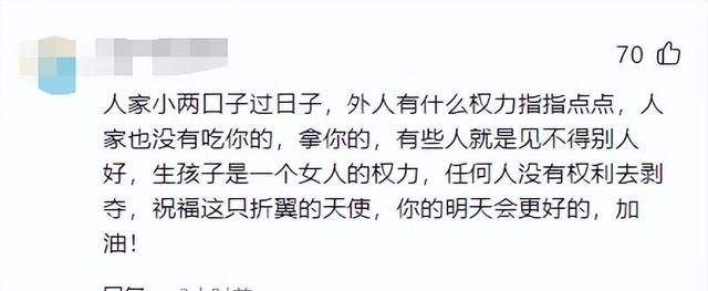 有网友说,人家小两口过日子,外人有什么权利指指点点的,人家也没吃你的、拿你的,有些人真就见不得别人好,生孩子是一个女人的权利,任何人都没有权利去剥夺,祝福这只折翼的天使,你的明天会更好。