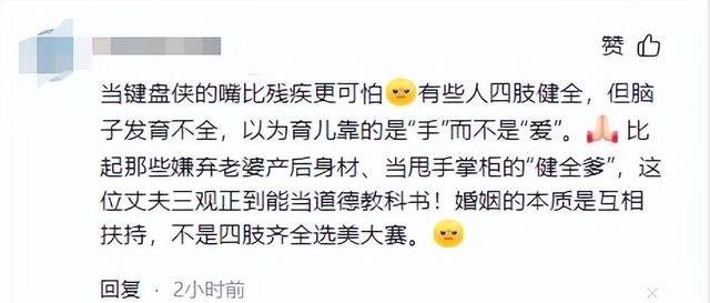 一些非常理性的网友则表示,那些键盘侠的嘴残疾更可怕,有的人四肢健全,但是脑子却发育不全,以为育儿靠的是手而不是爱,比起那些嫌弃老婆产后身材、当那个双手掌柜的人,这位丈夫的三观算是非常正的了。
