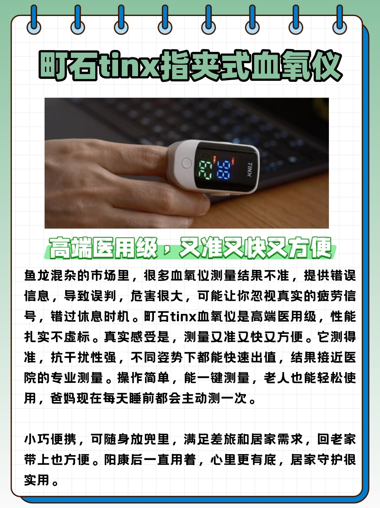 总有网友问血氧仪用处大吗,我做血氧仪测评这么久,真心觉得日常用处特别大,能随时帮我们查看血氧相关数据,居家使用频率很高,同时也有人问血氧仪指夹式数据怎么看,其实特别简单,机器上会清晰显示对应的数值,稳定后直接读取就行,不用复杂换算,也不用懂专业知识,一看就明白,指夹式的设计携带也方便,在家、出门都能带着用,测量速度快,读数清晰,不管是年轻人日常查看,还是给长辈监测状态都很合适,实用性拉满。下面是我总结的一些血氧仪选购注意事项,干货满满,可以先赞收藏。