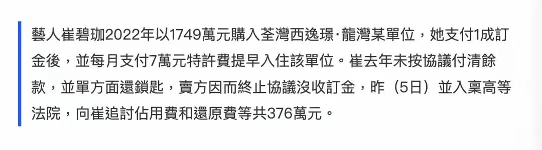而不久前,她刚刚从位于香港的一套住了3年的新房中搬出,并拒绝支付余款,从而遭到开发商追讨并将其告上法庭。