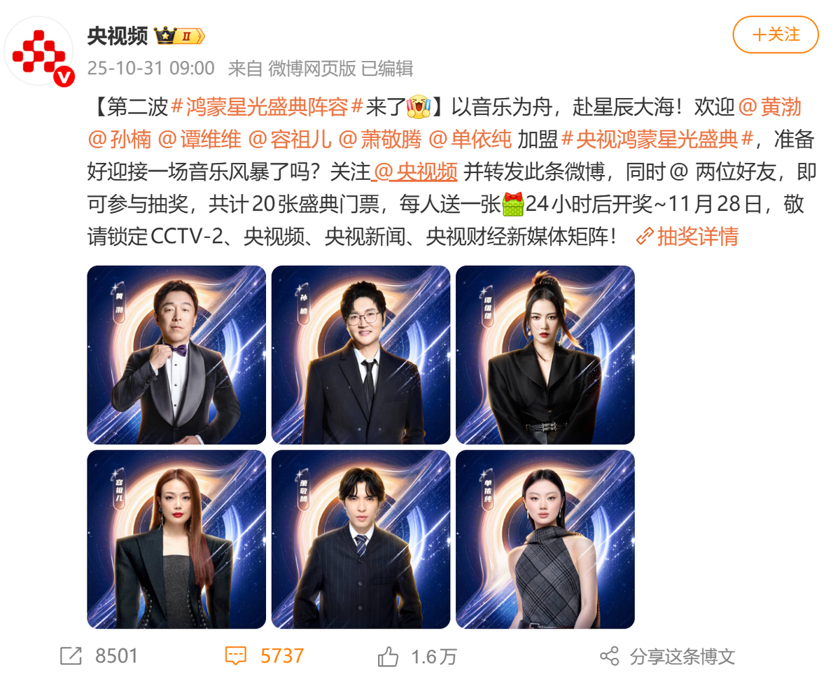 最近科技圈的大热点,绝对是由中央广播电视总台倾力打造的大型直播晚会——《鸿蒙星光盛典》正式定档,将于2025年11月28日在深圳龙岗大运体育中心盛大启幕。届时,不仅数万名现场观众将共同见证,盛典也将通过央视财经频道(CCTV-2)、央视频、央视新闻、央视财经同步直播。现场不光有萧敬腾、谭维维、黄渤这些大明星撑场,舞台的科技感更是直接拉满。掐指一算,华为新旗舰手机也快发布了,到时候会不会在星光盛典上搞点小暗示,甚至直接 “明牌” 呢?