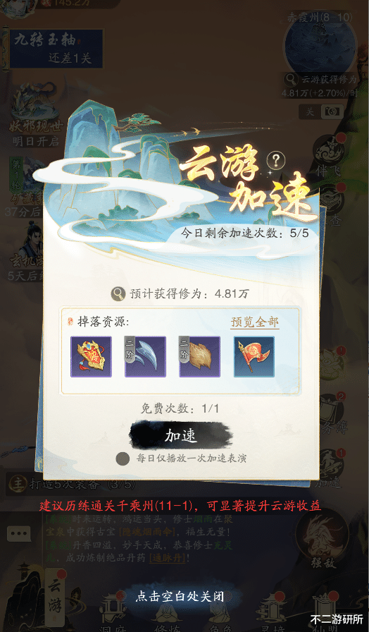 更贴心的是,《踏风行》还为道友们准备了如同外挂的“云游加速”功能,点击一次即可获得一小时的云游收益。而虽然云游加速分为无消耗和消耗造化两种,但由于《踏风行》里获取造化非常简单,提升功法和古宝又能增加免费加速次数,即便是像小编一样的白嫖党也能每天拉满,让修为如滚雪球般暴涨。再加上修复灵脉、解锁新地图、养成古宝和功法都能增加云游挂机的效率,突破境界真就如同喝水一般。正如论坛某位道友分享的心得:“每天上线五分钟,领完挂机奖励再加速就可以突破境界了,真爽!”。