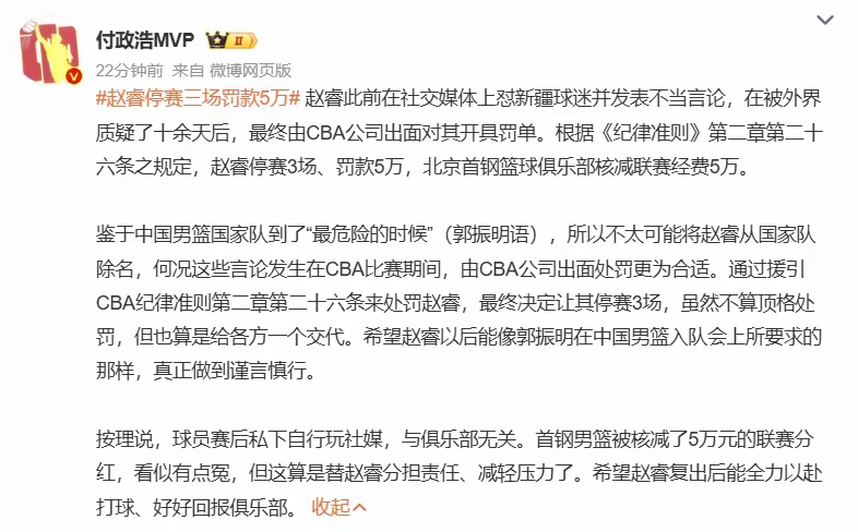 道歉没能抵消罚单。2月11日,CBA公司的一纸公告,为赵睿的“地域歧视”言论风波画上句号——停赛3场、罚款5万元,北京首钢俱乐部亦连带被核减经费5万元。十天前那条“新疆边上待一待”“回去打馕吧”的回复,终究让这位国家队队长付出了沉重代价。