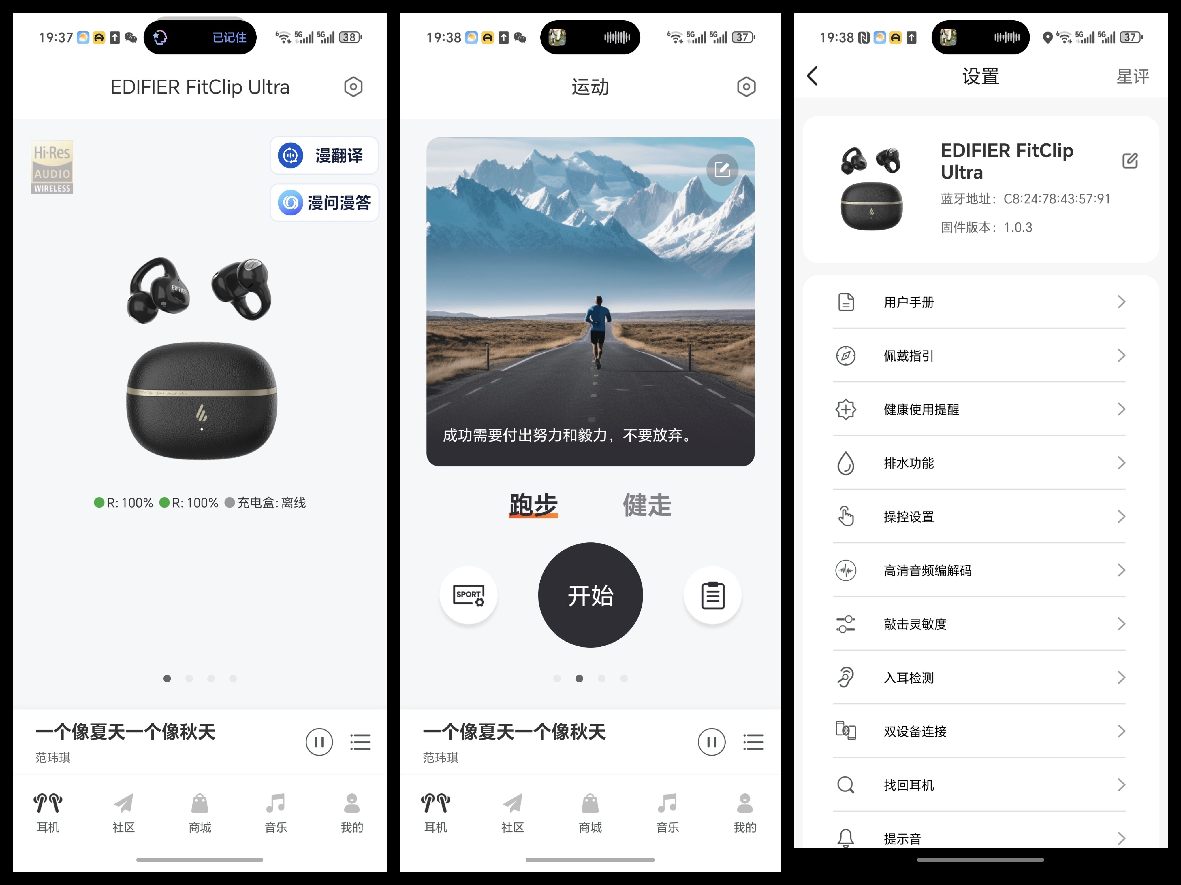 值得一提的是,漫步者是有专属App的,在打开App之后有很多功能,就比如运动模式,在打开之后,运动时长/里程/路线/配速/卡路里一目了然 运动数据可一键分享。在里面还能切换音效模式,想要什么样的音效。自己就可以调节。还有耳机定位防丢、智能排水功能等等,不得不说这APP确实强大。