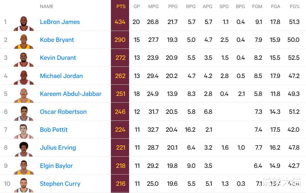 KD在全明星总得分排名历史第3,在其之前的是290分的科比,第1则是已经出战过20场全明星正赛的詹姆斯,其合计拿到了434分且夺得过AMVP。