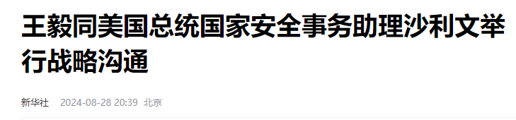 新华社2024-08-28:王毅同美国总统国家安全事务助理沙利文举行战略沟通
