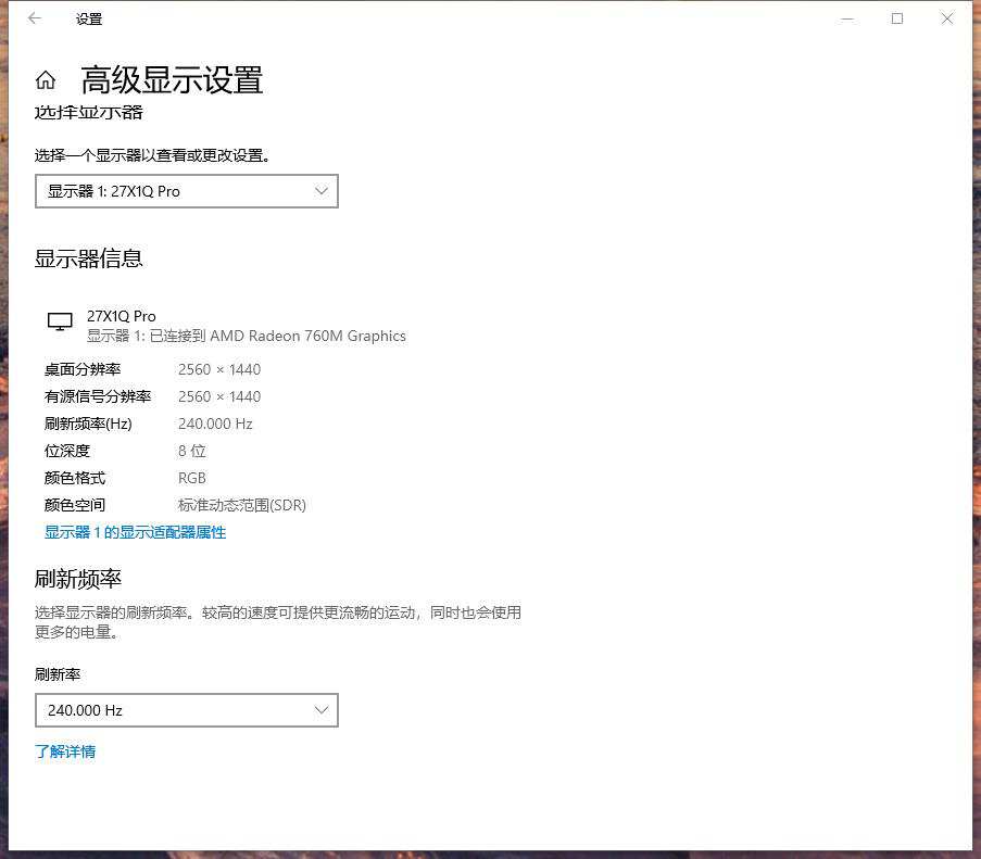 连接电脑以后简单查看了一下这款显示器的信息,辨率为2560*1440,刷新率也是实打实的240Hz。