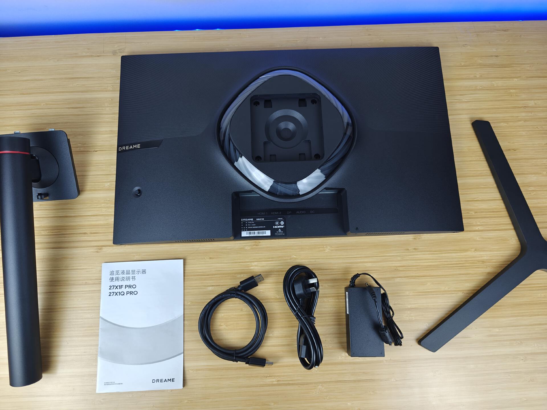 这款追觅电竞显示器27X1Q Pro给到的配件很有诚意,除了显示屏主体以外,还包含金属底座和支架,电源和一根DP线,当然还有说明书。
