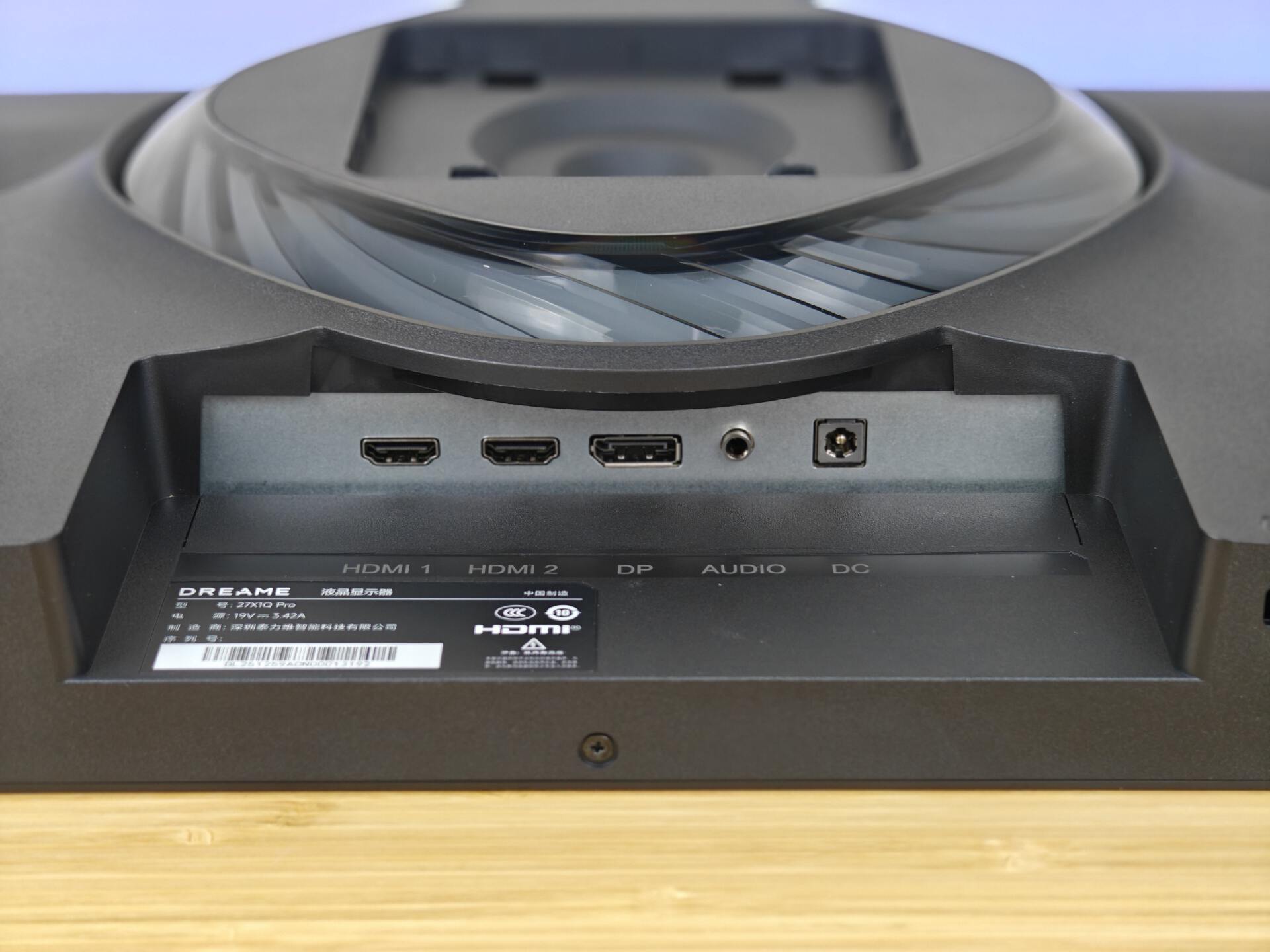 接口区位于屏幕背面下侧居中位置。从左向右依次是2个HDMI2.0接口、1个DP1.4接口、1个3.5mm音频输出接口和1个电源接口。