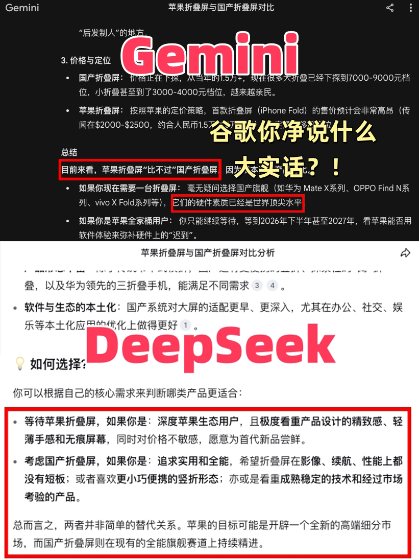 问了Gemini和DeepSeek,苹果折叠能不能比得上国产折叠屏,只想说谷歌你净说什么大实话!直接就说苹果折叠比不过,还说国产折叠的硬件素质已经是世界顶尖,说得我这个国人都有点不好意思了。而DeepSeek的回答就两碗水端平。