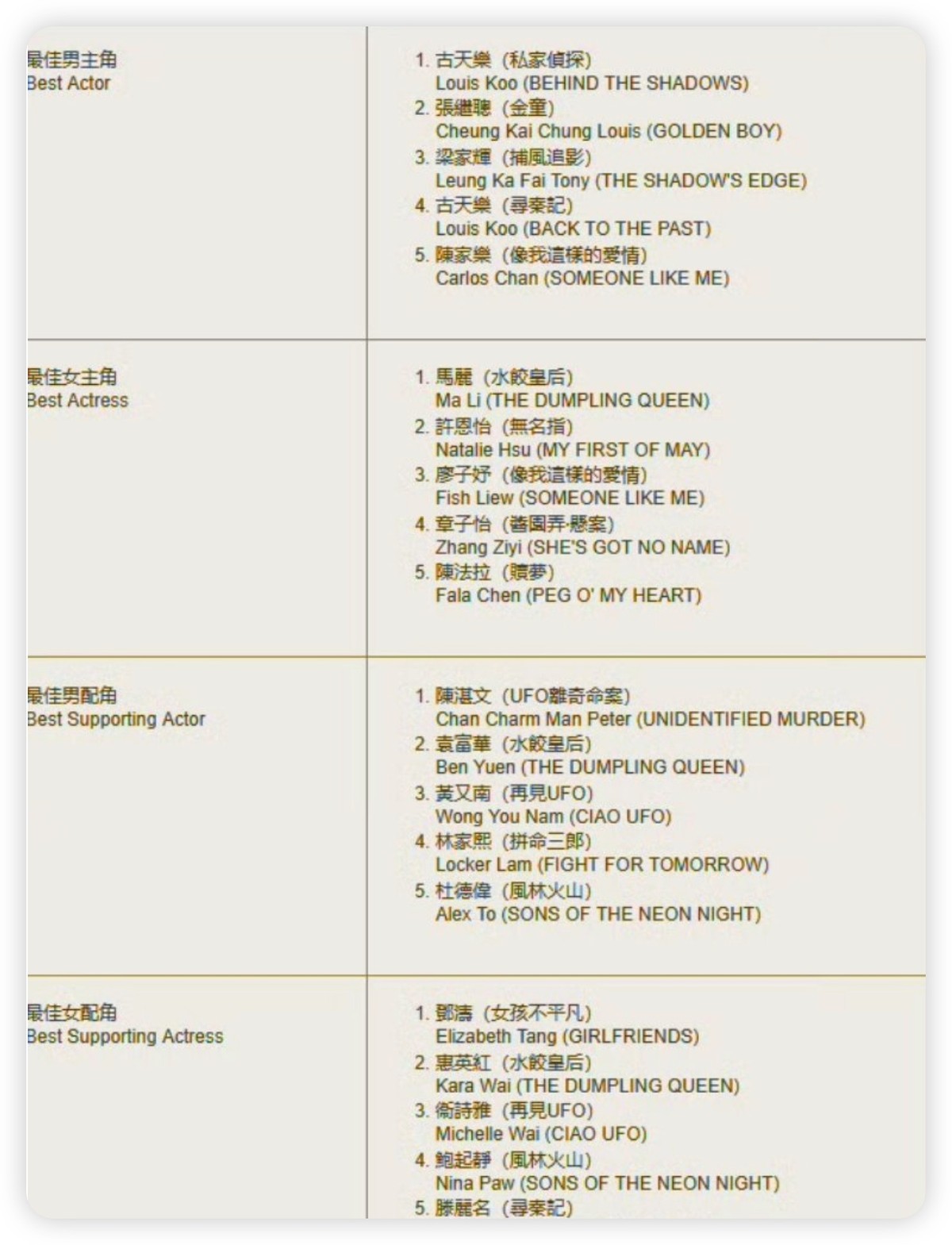 这种文戏细腻入骨、武戏爆发力十足的表演,放在港片任何时期都堪称教科书级别,也让他在提名者中一骑绝尘。