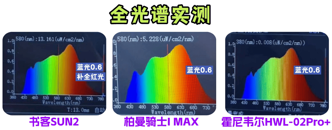 实测原因:实测全光谱是非常重要的一环,市面上很多护眼灯虽然标记着全光谱,但是实际上蓝光峰值依然很高,红光、绿光断层明显,虽然从表面光线上看不出区别,但是长时间下来,不仅会引起视觉疲劳,还会影响视力健康。