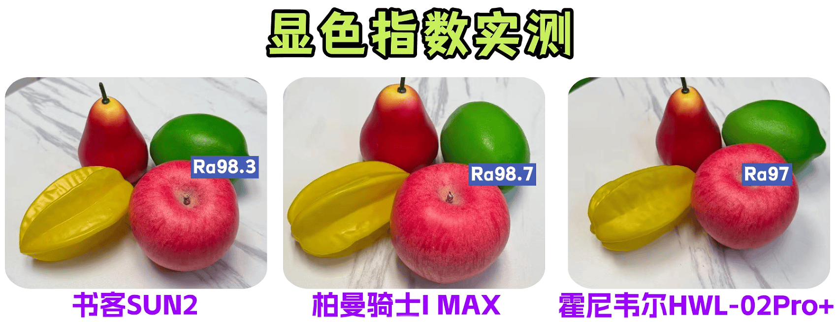 从上图来看,每款颜色的差距不大,短时间内很难看出区别,而从实测的显色指数来看,其中柏曼骑士I MAX、书客SUN2这2款的显色指数最高,实际显色指数在Ra98以上,能够呈现高原度还原的光线,并且值得一提的是,书客SUN2小太阳还是一款符合TM—30光学严苛标准,并严格把控,做到色彩逼真度更是直接达到了Rf≥98。