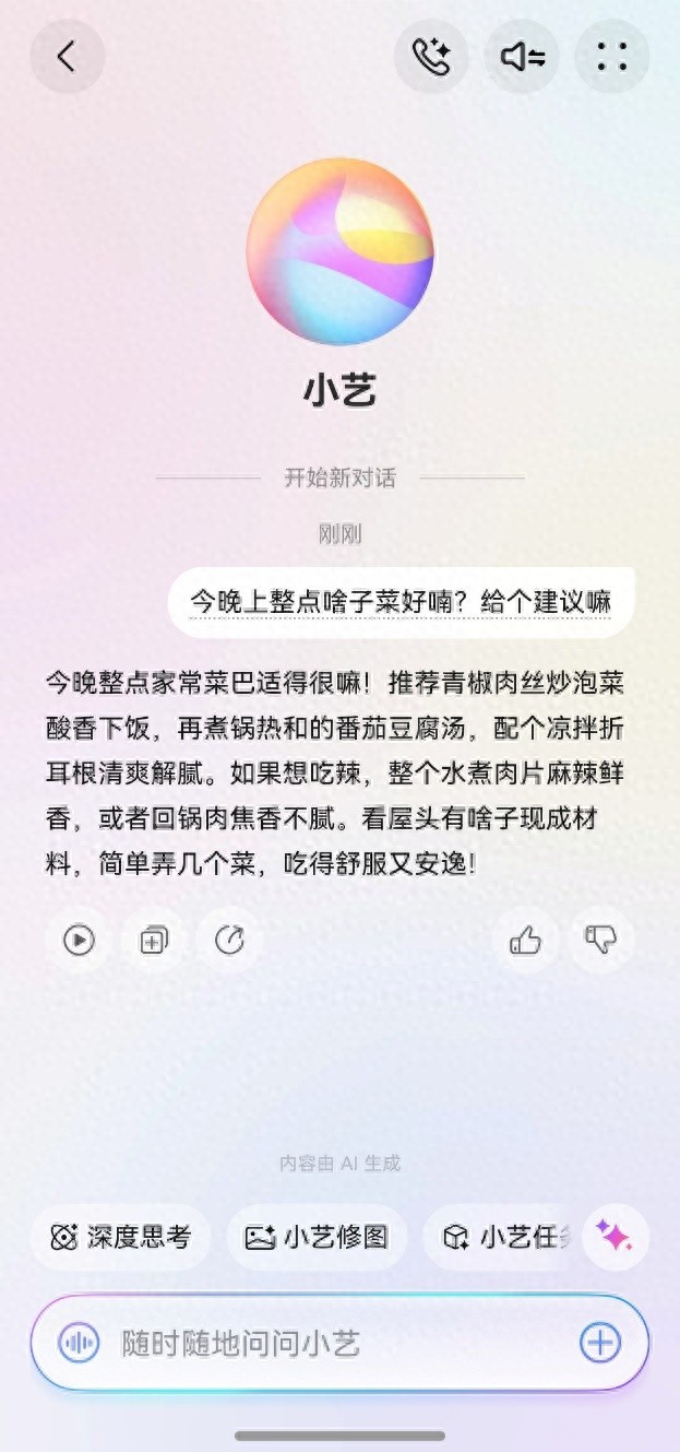 “今晚上整点啥子菜好喃?给个建议嘛”“放首那个《麻雀》,要李荣浩唱嘞那个哈”……小艺不仅听得懂,还能用一口地道的四川话回复。这一来一回的方言对话,那股熟悉的“椒盐味儿”瞬间就上来了。