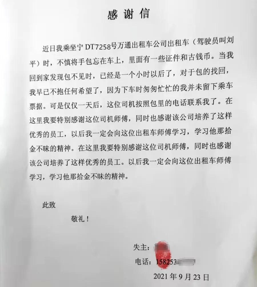 包里装有银行卡和一些古钱币,价值很难估算,为保险起见,刘师傅将包送到了运管部门,然后继续跑车。“人到中年,身上负担比较重,这件事也只是我工作中的小插曲,后来也没问运管工作人员是否找到了失主,更没想到失主还专门写了一封感谢信。”