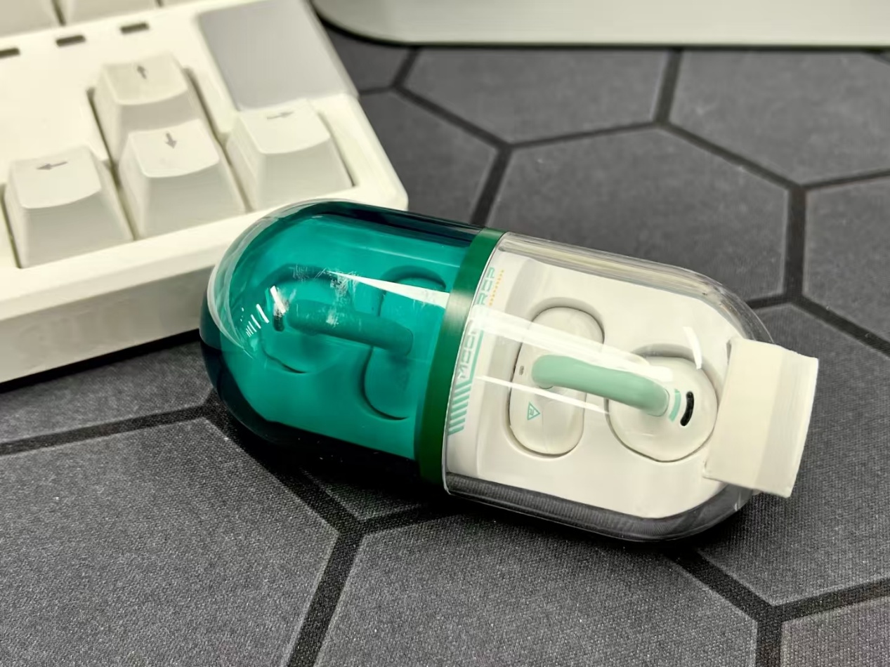 这款耳机的外观辨识度超高,采用独特的 “胶囊” 形状设计,耳机壳线条流畅圆润。充电仓采用旋转开合设计,搭配耳机磁吸收纳功能,使用起来趣味十足。耳机外层包裹亲肤热塑性 TPU 材质,搭配钛合金弹性支撑,遵循人体工学设计,佩戴柔软舒适。