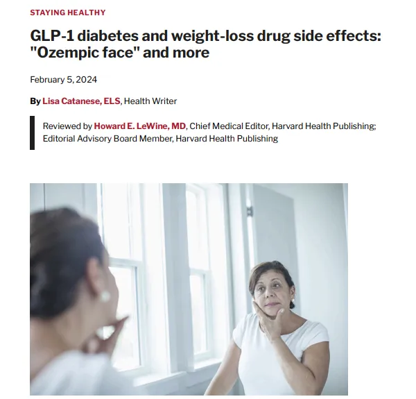 司美格鲁肽临床试验STEP 1和SUSTAIN 8揭示了一个被忽视的真相:服用GLP-1药物后减掉的体重中,约40%是去脂体重,即肌肉、骨骼等非脂肪组织。这与短时间内体重骤降直接相关——面部皮下脂肪流失导致皮肤松弛下垂,被业界称为“Ozempic face”(司美格鲁肽脸)。对于原本偏瘦的人群,面部松弛的影响更为显著;即便是真正的肥胖患者,肌肉流失也会带来代谢率下降、体能减弱等长期隐患。
