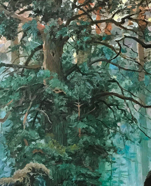 我去俄罗斯旅游过,只是没深入森林,还去过天山和阿勒泰山玩,也能大略体验原始松林的那种神秘氛围。这幅画原作139cm×213cm,比较大,再小一点都无法画到这么细致,也体现不出身临其境的感觉。家里没那么大空间,我只好从网上买一幅1米×1.5米的带框画布,就这已经比我家所有的油画都要大了。相比那幅《林中雨滴》,当年自己锯木条,钉木框,绷画布,刷胶底,现在省事太多了。