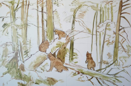林中的一天又开始了,生命正处在勃发和酥醒之中,当然,最吸引人的还是那四只熊,大概是母熊率领三只熊宝宝在嬉戏,两只熊宝宝爬上断树玩耍,熊妈妈不放心地在下面看着,生怕孩子掉下来。最有趣的是第三只熊宝宝,傻乎乎站在断下去的上半截树干上,正在呆头呆脑往空地望去,把人们的视线引向“诗和远方”。这只小熊的姿态尤其可爱,胖乎乎肉嘟嘟,歪着脑袋,多像家中调皮小弟弟。