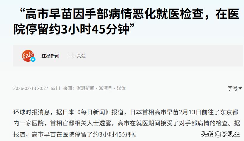 高市早苗病情恶化2月13日,日本首相高市早苗前往东京一家医院接受检查,全程停留近四小时,官方随后证实,她长期患有的类风湿性关节炎近期出现恶化,右手已有两根手指关节变形,甚至影响到了日常履职。