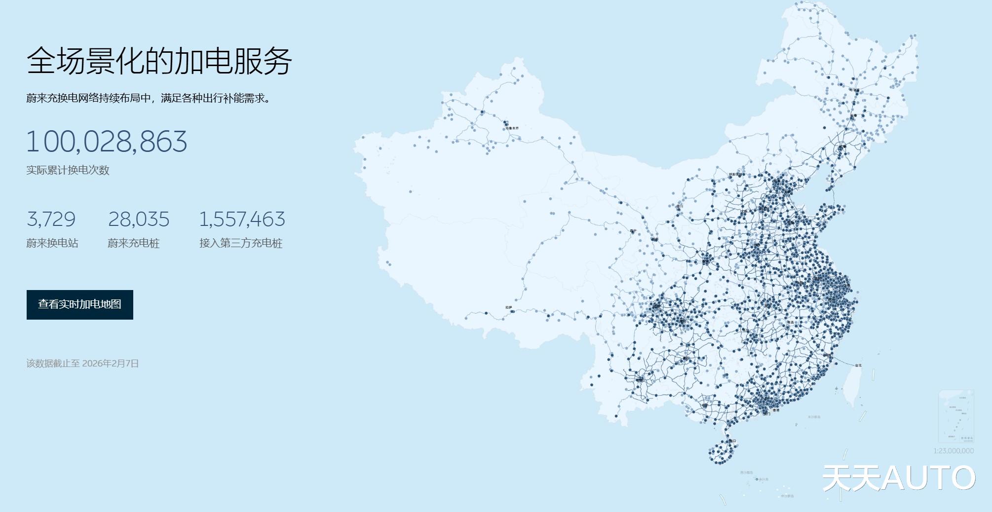 截至2月5日,蔚来充换电网络覆盖全国,总数达8627座,其中换电站3729座,高速公路服务区换电站超过1020座,联通全国550城市,打通9纵11横16大城市群高速换电网络。