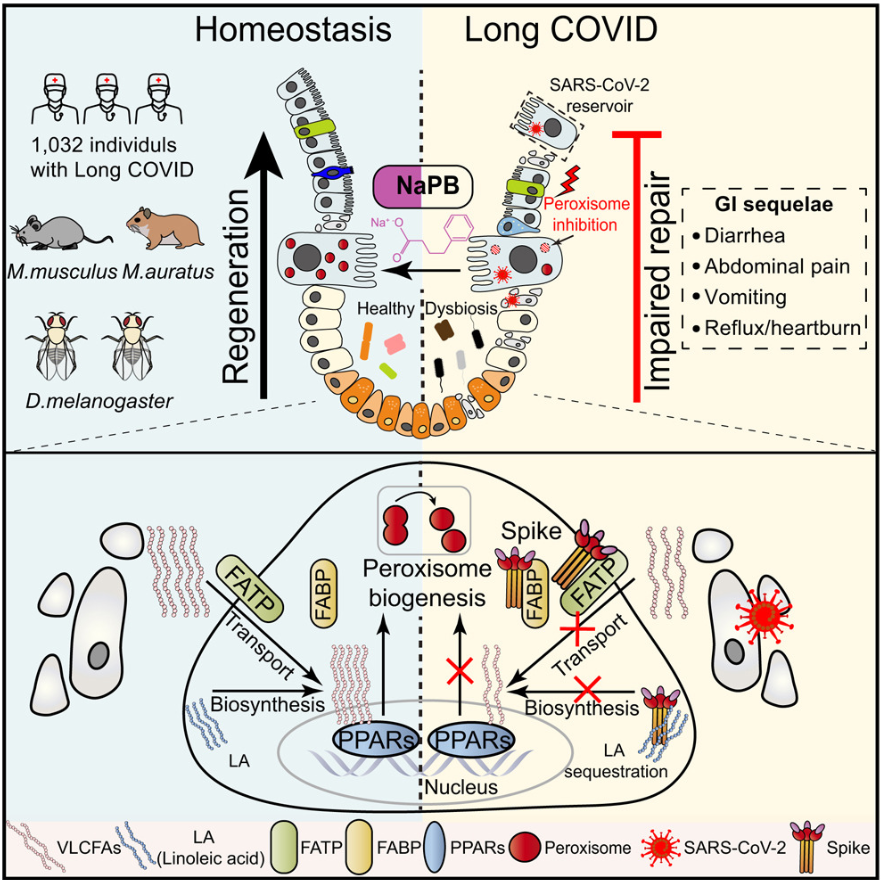 肠道干细胞在维持和修复肠道功能中扮演着至关重要的角色,堪称肠道的“守护者”。但研究发现,病毒刺突蛋白会干扰细胞内的超长链脂肪酸代谢,抑制一条名为“PPAR - 过氧化物酶体”的重要信号通路,导致肠道干细胞分化受阻。这就好比工厂的生产线出了故障,功能细胞的数量不断减少,肠道菌群也随之失衡,腹泻和炎症便会进一步加剧。