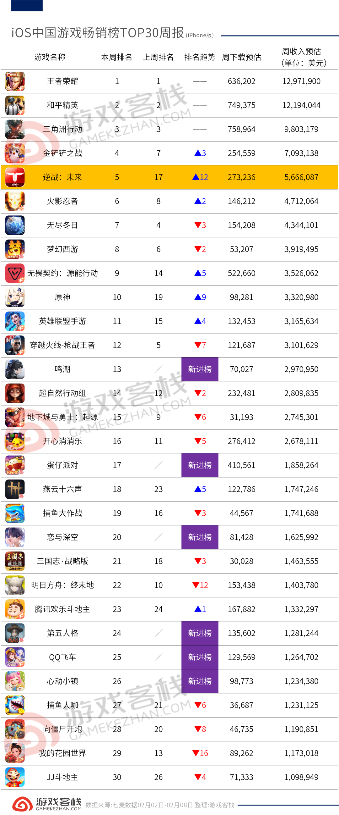 另外,《鸣潮》《蛋仔派对》《恋与深空》《第五人格》《QQ飞车》《心动小镇》上周也重新回归畅销榜,在即将来临的春节档中,可以预见有合作、对抗、休闲玩法的游戏也会成为热门。