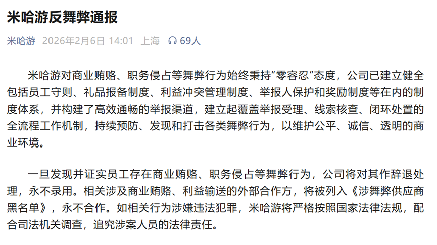 2月6日,米哈游官方发布了《米哈游反舞弊通报》,在通报中披露了多起内部查实案件,并公布了供应商黑名单。米哈游称,对商业贿赂、职务侵占等舞弊行为始终秉持“零容忍”态度。一旦发现并证实员工存在商业贿赂、职务侵占等舞弊行为,公司将对其作辞退处理,永不录用。